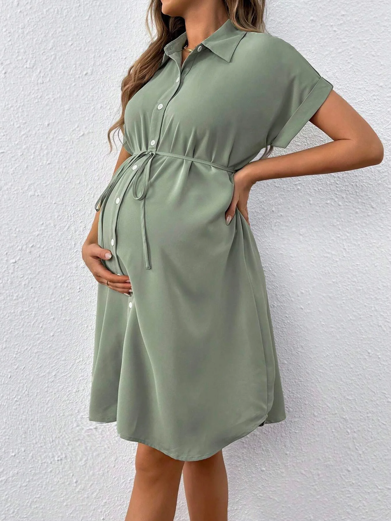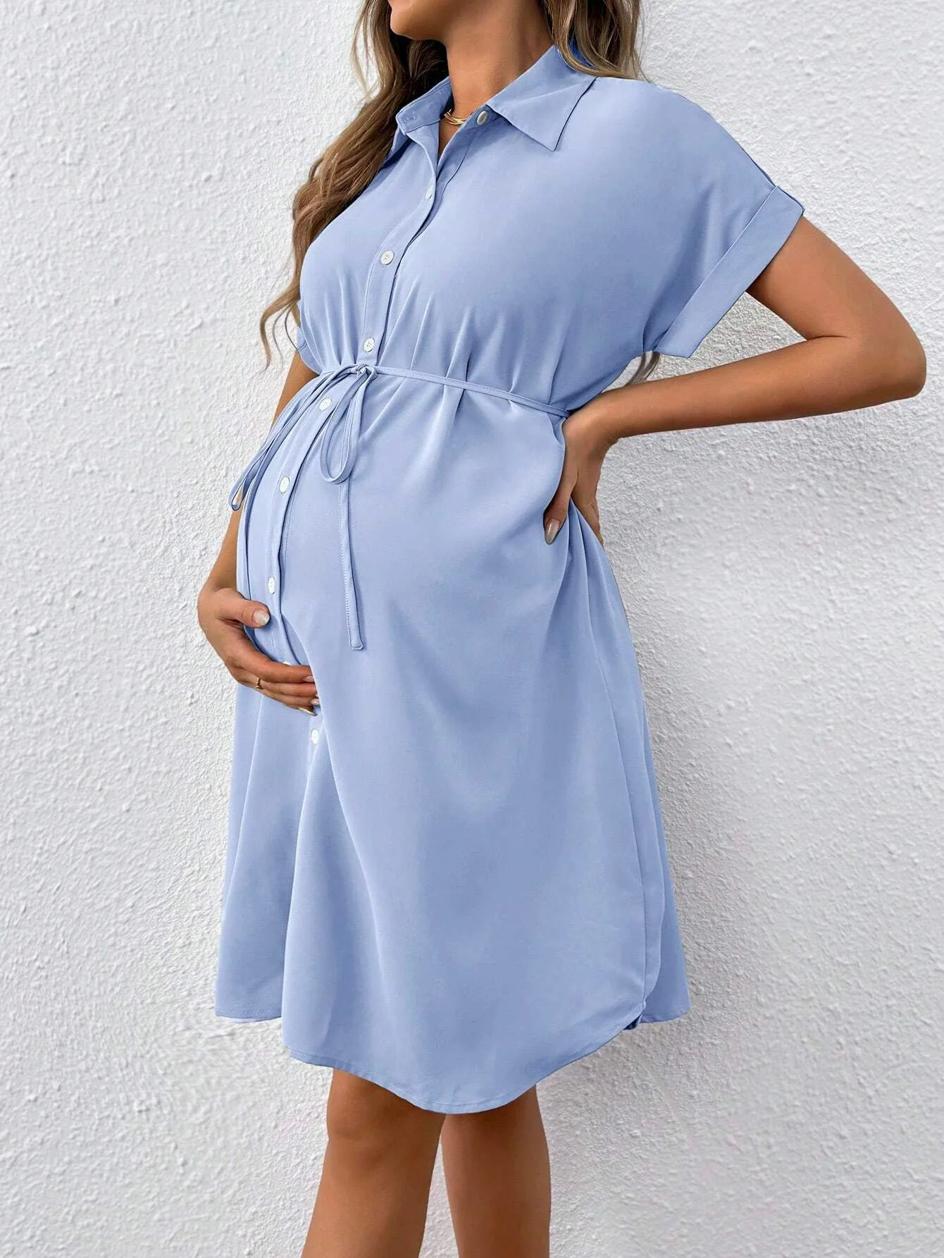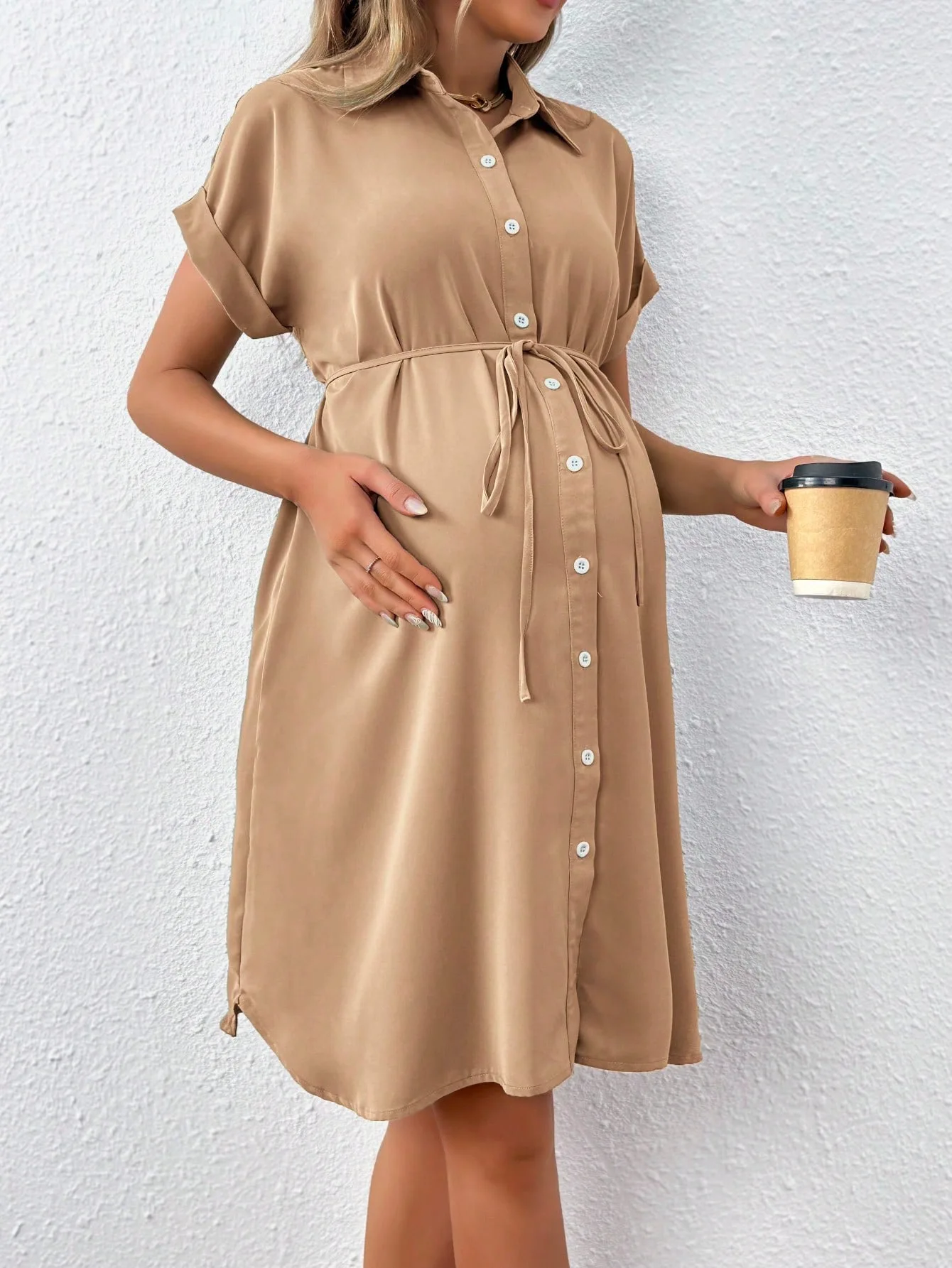 Designed for sunshine and ease, this short-sleeve maternity shirt dress blends everyday comfort with timeless style. Its lightweight fabric and relaxed fit keep you cool through every trimester, while the adjustable tie waist adds shape and confidence to your growing bump.